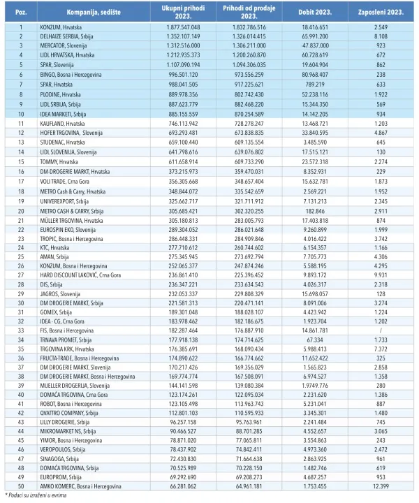 Objavljena je lista Top 50 trgovaca u regionu, rangiranih prema ukupnim prihodima ostvarenim u 2023. godini (s obzirom na to da nisu dostupni podaci za sve trgovačke lance iz prošle godine).