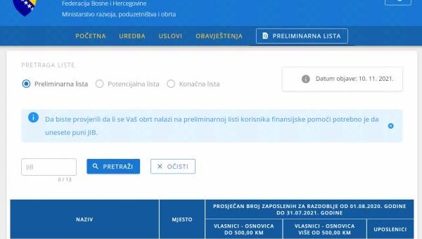 Federalno ministarstvo razvoja, poduzetništva i obrta je, u skladu sa Uredbom o mjerama finansijske pomoći obrtima i ostalim samostalnim djelatnostima u Federaciji BiH u cilju ublažavanja negativnih posljedica pandemije COVID-19 objavilo preliminarnu listu korisnika finansijske pomoći obrtima i ostalim samostalnim djelatnostima na internet stranicama ovog ministarstva i Vlade Federacije BiH. Potencijalna lista se nalazi na linku.