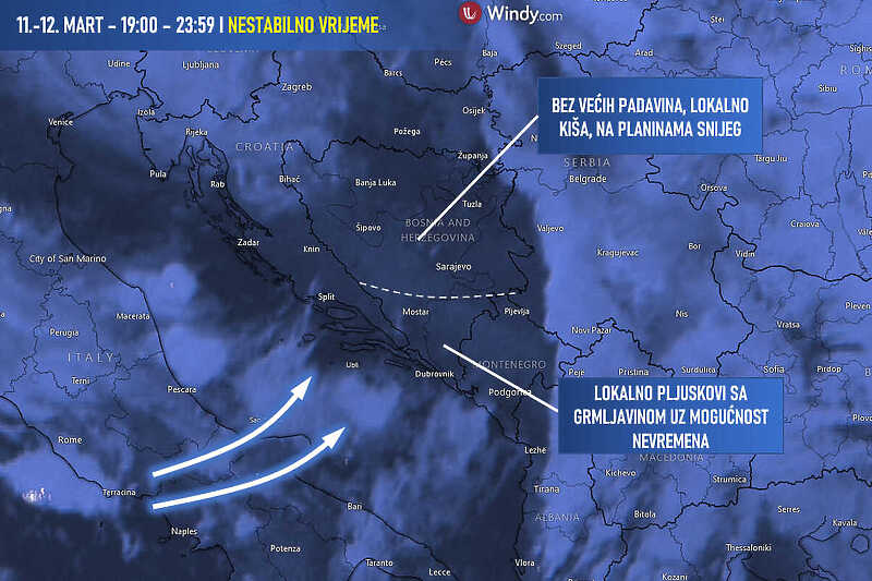 Što se tiče vremenskih prilika za danas, meteorolozi sa BHMeteo.ba najavljuju da sa jugozapada pristižu nove padavine koje su u protekloj noći donijele kišu. Na jugu i istoku Hercegovine uz lokalnu mogućnost grmljavine i nevremena.