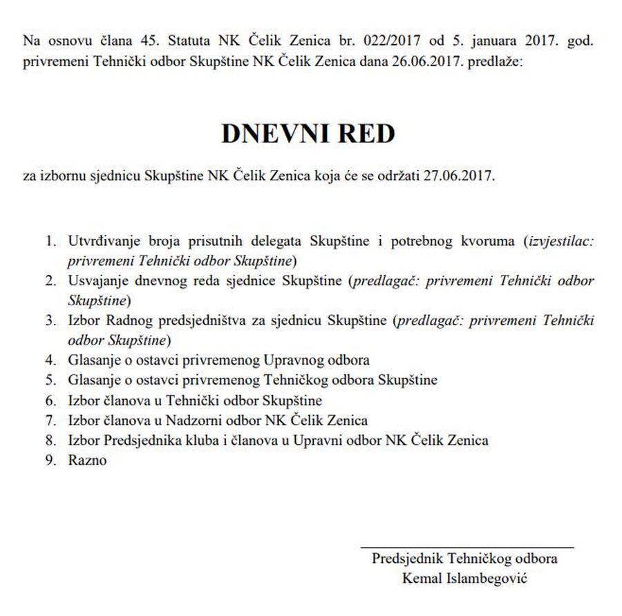 Objavljeni Dnevni red sutrašnje Skupštine NK Čelik i liste kandidata za izbore na Skupštini – Na stranici NK Čelik objavljeni Dnevni red sutrašnje skupštine i liste kandidata – Obavještavamo članove kluba NK Čelik da dnevni red sutrašnje skupštine i liste kandidata sa kandidaturama zaprimljenim do 18:00 26.6.2017. su objavljeni u nastavku – Takođe napominjemo da se kandidature mogu podnijeti i sutra u periodu od 10 do 14h.