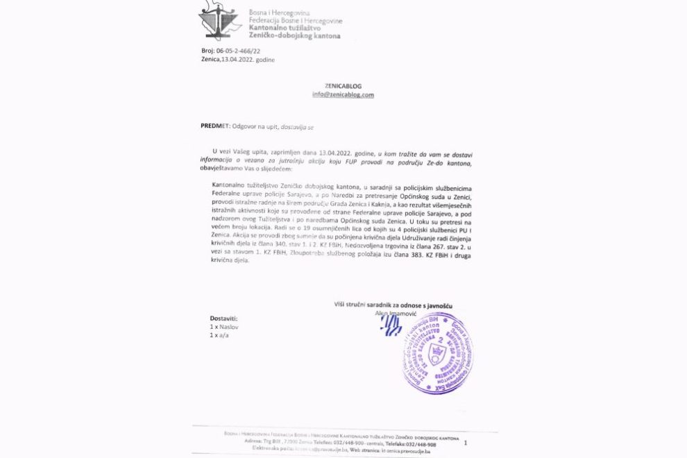 Četiri službenika Policijske uprave Zenica 1 su među osumnjičenim za krivična djela koja su predmet jutrošnje policijske akcije, potvrđeno je Zenicablogu u Tužilaštvu ZDK.