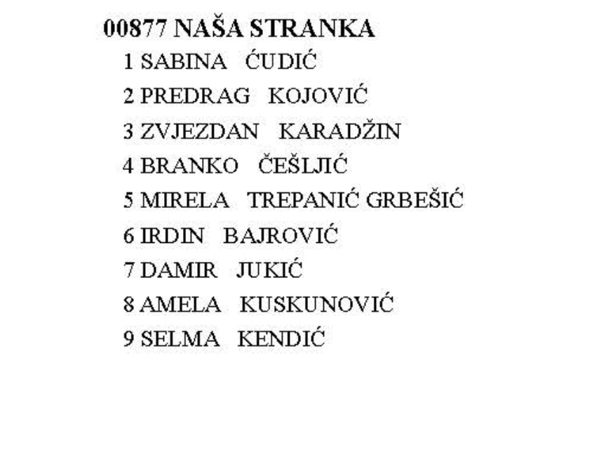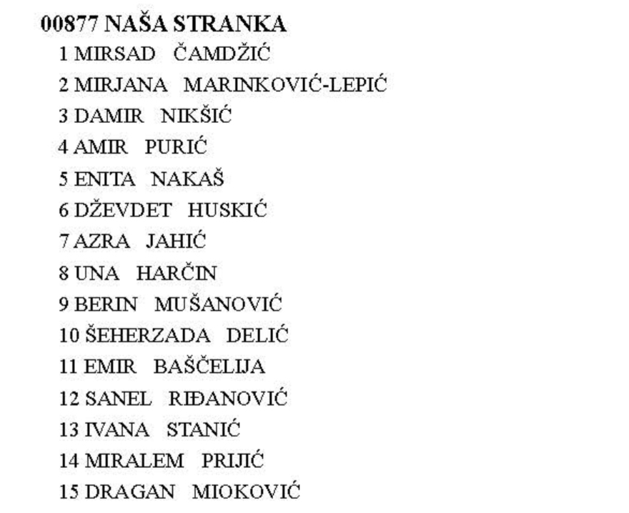 Kompenzacijsku listu Naše stranke nosi aktualni zastupnik te stranke u Zastupničkom domu Parlamenta Federacije BiH Mirsad Ćamdžić. Aktualna drćavn zastupnica Mirjana Marinković-Lepić je druga na listi dok je konceptualni umjetnik Damir Nikšić na trećem mjestu.