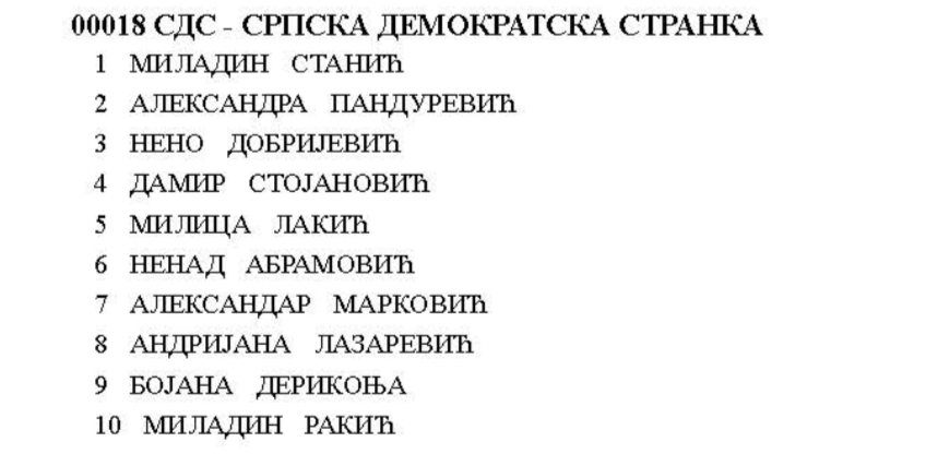 Listu SDS-a za kompenzacijske mandate nosi Miladin Stanić, aktualni poslanik te stranke u Narodnoj skupštini RS. Na drugom mjestu je Aleksandra Pandurević, bivša državna zastupnisa SDS-a.