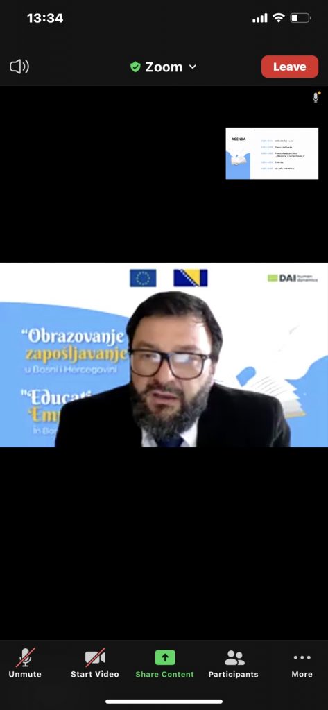 „Današnji sastanak, između ostalog znači i zvanično otpočinjanje implementacije navedenog Projekta u trajanju od 30 mjeseci, a za čije finansiranje je Evropska unija izdvojila 2,6 miliona eura, a u cilju unapređenja kvalitete obrazovanja u BiH i njegovog približavanja standardima EU, odnosno usklađivanja ljudskih resursa – obrazovanja sa potrebama tržišta rada. Podsjetiću da su na projektni zadatak sa čijom implementacijom danas započinjemo saglasnost dale sve obrazovne vlasti u Bosni i Hercegovini, te da bi se njegova implementacija trebala odvijati kroz 4 komponente i to: