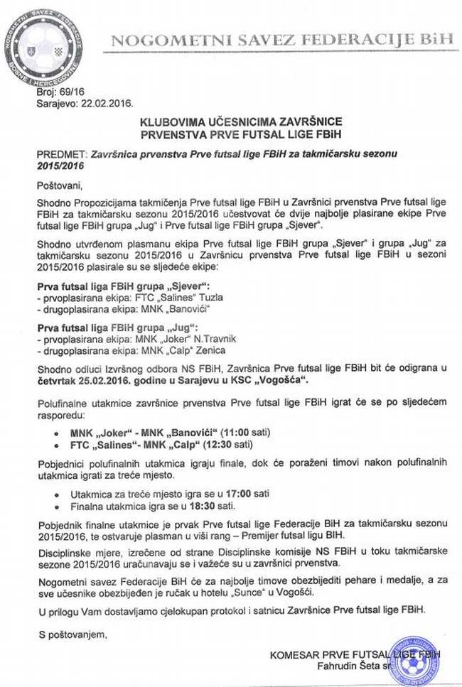 Ranije je žrijebom odlučeno da se u prvom polufinalu koji je na rasporedu od 11:00h sastanu prvak “Juga” i drugoplasirana ekipa grupe “Sjever”, to znači da će prvo polufinale igrati MNK Joker Novi Travnik i MNK Banovići.