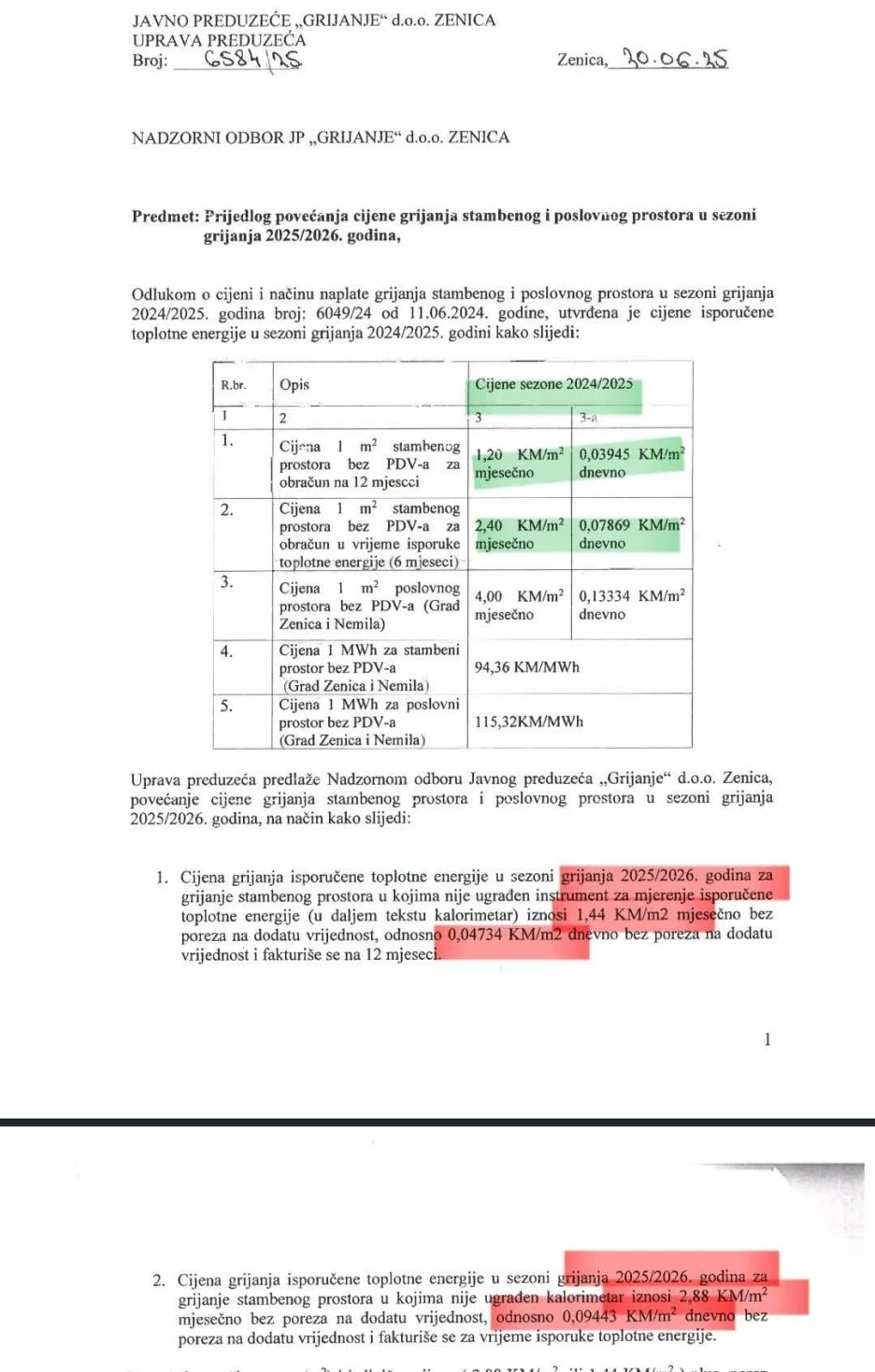Prema dostupnim materijalima za sjednicu, planirano je povećanje cijene grijanja s dosadašnjih 1,20 KM na 1,44 KM po kvadratnom metru za korisnike koji su u sistemu 12 mjeseci, dok bi sezonski korisnici koji koriste grijanje tokom šest zimskih mjeseci plaćali čak 2,88 KM po kvadratu.
