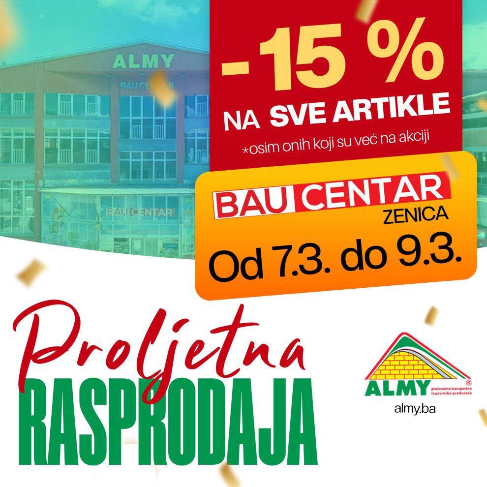 Poštovani kupci, od 07. do 09.03., pripremili smo za vas sniženje na kompletan asortiman u Bau centru Almy u Zenici.