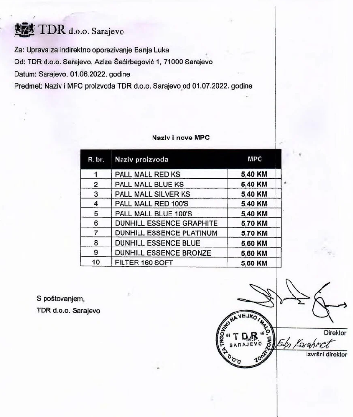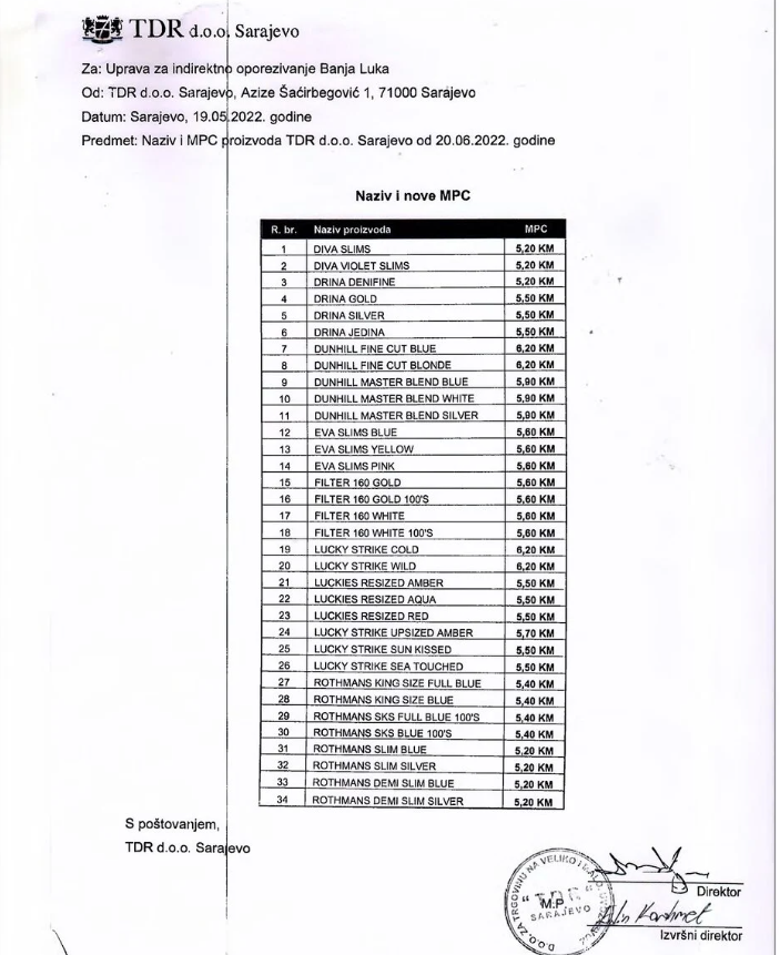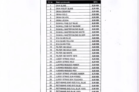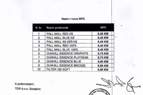 Uprava za indirektno oporezivanje (UIO) BiH je zahtjev za izmjenu cijena dobila prije mjesec dana, a do novog poskupljenja cigareta doći će početkom sljedećeg mjeseca, tačnije 1. jula kada će poskupiti još 10 vrsta cigareta istog proizvođača.