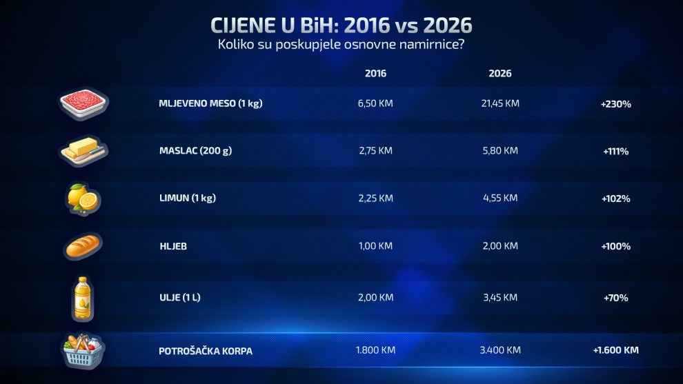 Građani Bosne i Hercegovine sve teže podnose svakodnevne troškove, dok inflacija i kontinuirana poskupljenja snažno opterećuju kućne budžete. Potrošačka korpa danas iznosi gotovo 3.400 KM, a poređenje cijena osnovnih proizvoda iz 2016. i 2026. godine otkriva razmjere promjena i pokazuje koliko je život u međuvremenu postao skuplji