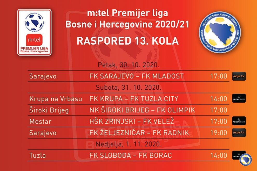 Od ovog petka do nedjelje na rasporedu 13. kolo m:tel Premijer bh. liga u nogometu – Trinaesto kolo m:tel Premijer bh. lige u nogometu bit će odigrano od petka do nedjelje, 30.10.do 01.11.2020.godine, a na rasporedu je šest utakmica. U petak se igra jedna utakmica, u subotu četiri, te u nedjelju jedna utakmica. Pet susreta će biti u direktnom TV prijenosu.
