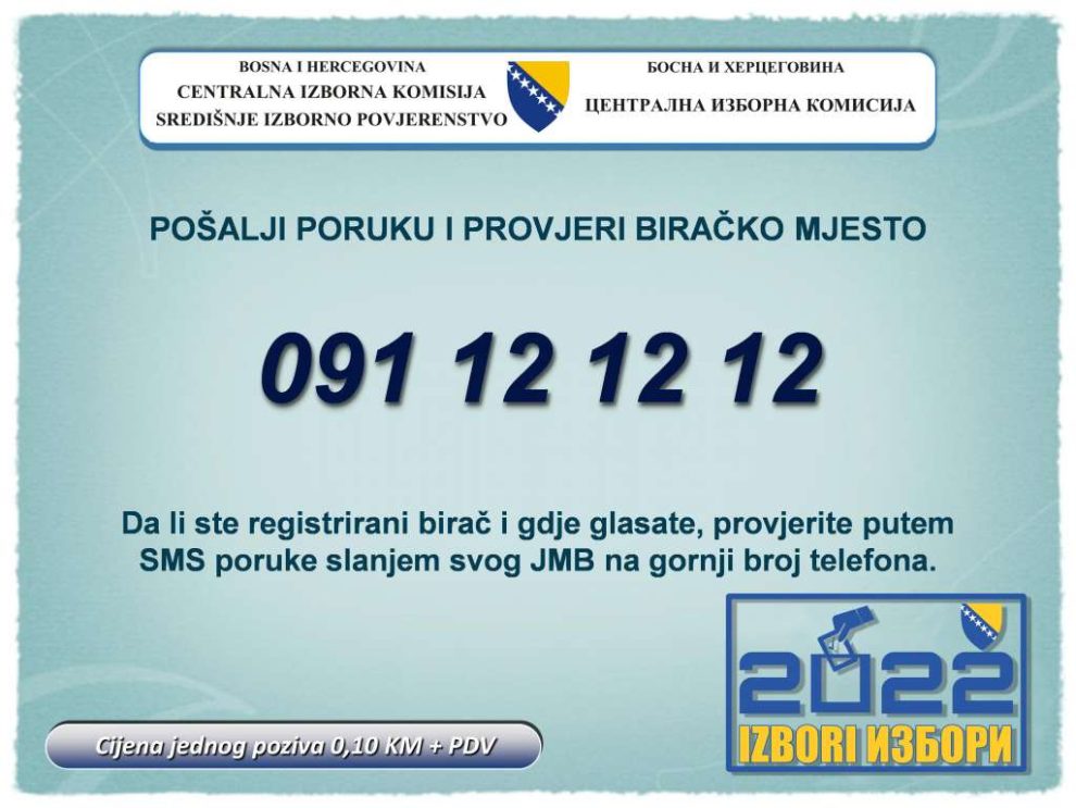 Od ponedjeljka, 12. septembra, bit će aktivan SMS centar za provjeru lokacije biračkog mjesta, saopćila je Centralna izborna komisija (CIK) Bosne i Hercegovine.