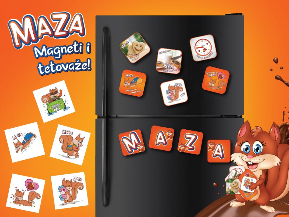 Kupovinom bilo kojeg kremnog namaza MAZA 700 grama, na polici ćete moći pronaći flat magnet koji vas najbolje opisuje. Ako ste kolekcionarski orjentisani tu su i „M“ „A“ „Z“ „A“ koje ćete morati skupiti odvojeno kako biste na kraju imali MAZA logo u punom sjaju na svom frižideru.