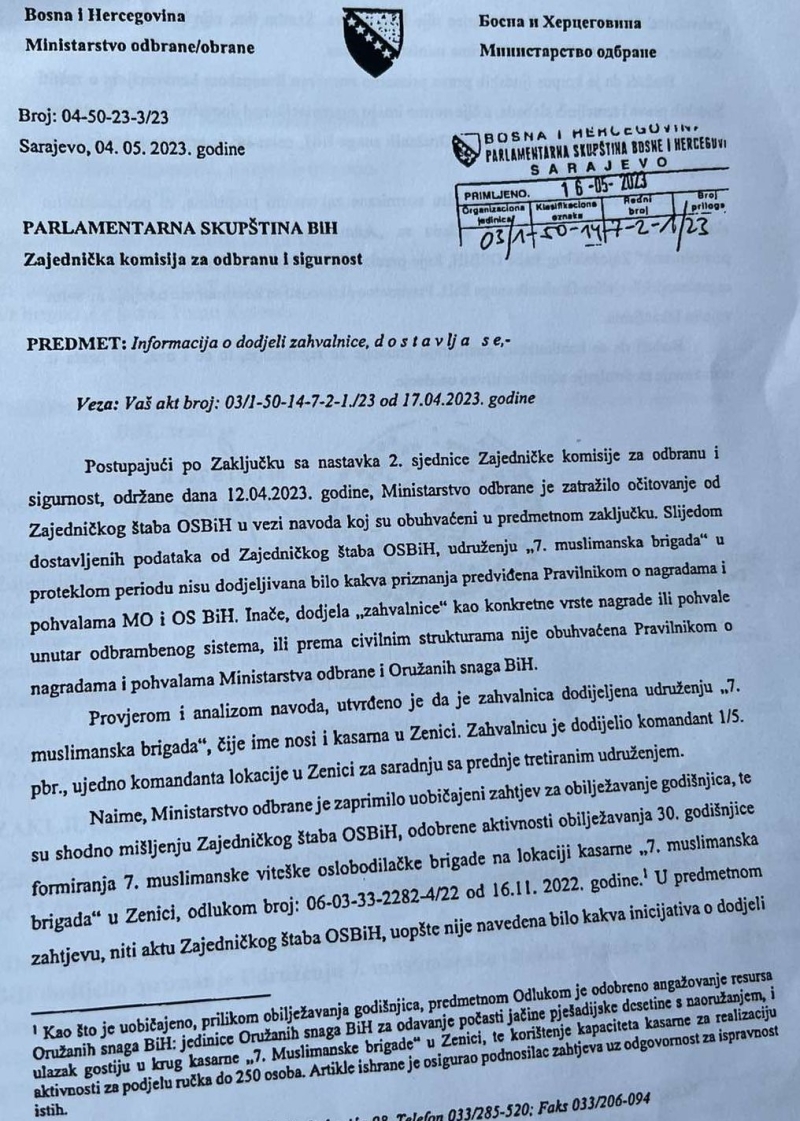 Navodi se i da je Ministarstvo odbrane dobilo uobičajeni zahtjev za obilježavanje godišnjice formiranja 7. muslimanske viteške oslobodilačke brigade na lokaciji ove kasarne i da nije navedena bilo kakva inicijativa o dodjeli zahvalnice, pa samim tim nije bilo ni odluke ministra uz konsultacije sa zamjenicima.