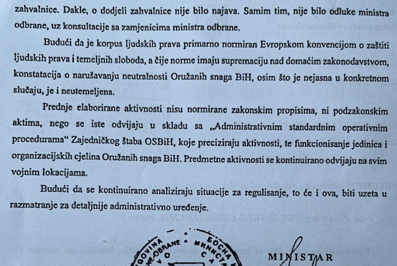 – Ako je tačno da je to učinjeno, traži se informacija ko je upoznat s tim i i na osnovu kojeg zakonoskog osnova proizilazi ovlaštenje da se uopće dodjeljuju takva priznanja, ko je i kada pokrenuo inicijativu i zahtjev da se priznanje dodjeli, kome je ona upućena i ko je odlučivao o tom prijedlogu. Traži se i informacija o tome da li je tim činom narušena neutralnost Oružanih snaga BiH – navodi se u zaključku.