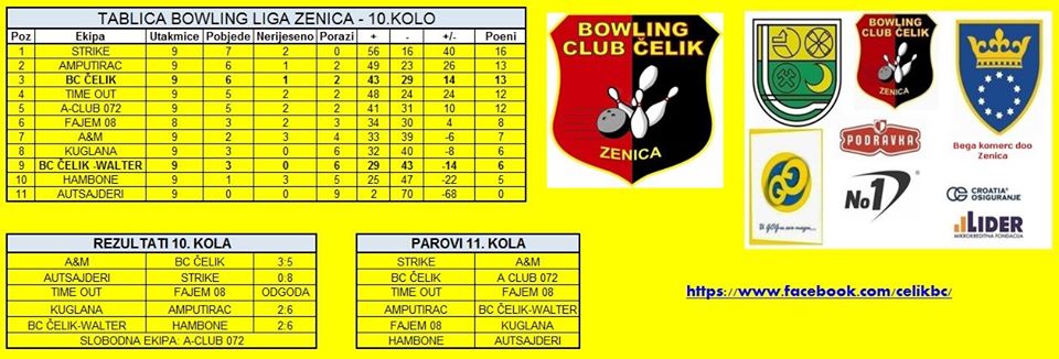 Odigrano deseto kolo Bowling Lige Zenica – Odigrani su susreti desetog kola Bowling Lige Zenica, sezona 2019/2020. Zbog ranijeg odustajanja ekipe Spare, takmiči se 11 ekipa.