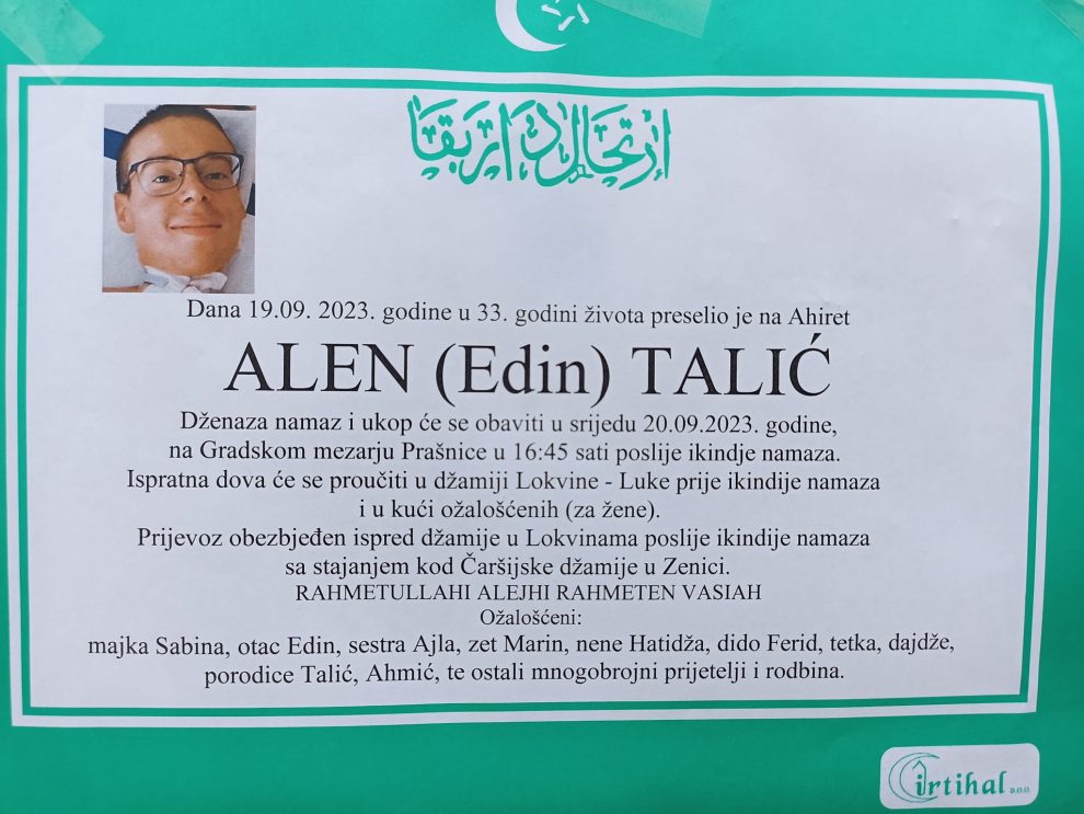 Dženaza namaz će se obaviti sutra (20.09.) na Prašnicama u 16:45 sati poslije ikindije namaza, a polazi ispred džamije Lokvine – Luke gdje je obezbjeđen i prevoz autobusom. Ispratna dova će se proučiti u džamiji Lokvine – Luke prije ikindije namaza i u kući ožalošćenih (za žene).