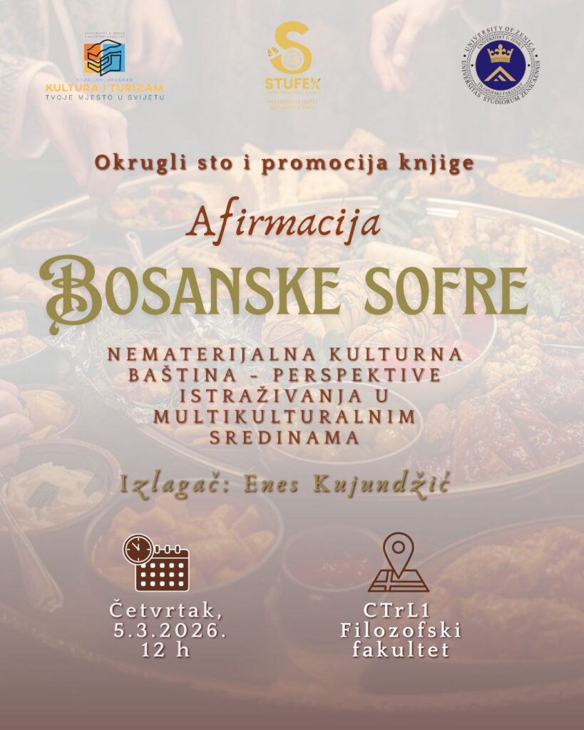 Na Filozofskom fakultetu Univerziteta u Zenici u četvrtak, 5. marta 2026. godine, održan je okrugli sto i promocija knjige Afirmacija bosanske sofre: nematerijalna kulturna baština – perspektive istraživanja u multikulturalnim sredinama. Događaj su organizirali članovi Studijskog programa Kultura i turizam, a realiziran je u okviru programa Drugog studentskog festivala kulture STUFEK 2026.