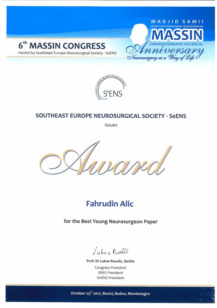Pored toga nas specijalizant neurohirurgije Alić Fahrudin dobio je nagradu za najbolji rad mladih neurohirurga, sa prezentacijom pod naslovom” Succesful management of cerebral abscess linked with subdural intracranial empyema as a consequence of pansinusitis: case report”