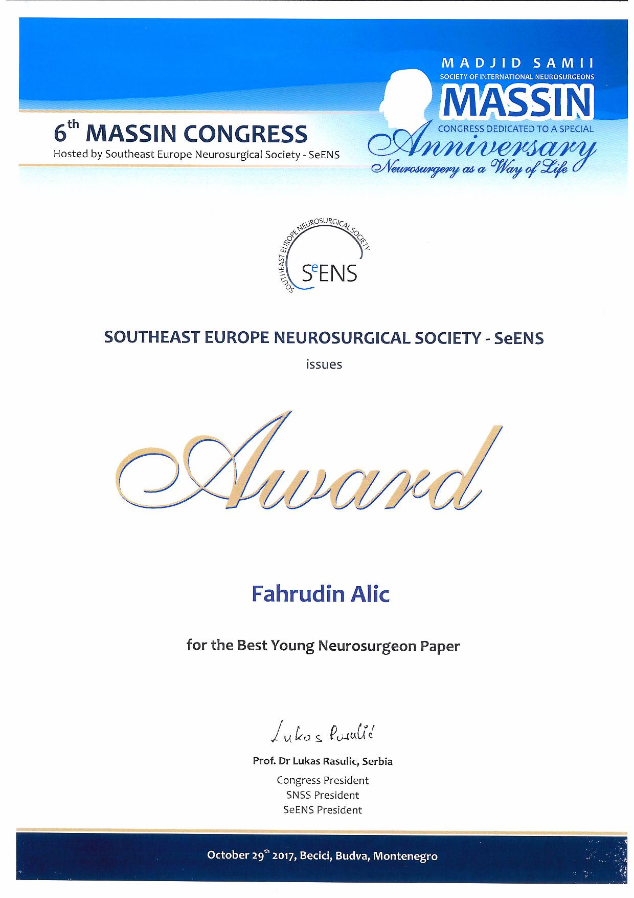 Pored toga nas specijalizant neurohirurgije Alić Fahrudin dobio je nagradu za najbolji rad mladih neurohirurga, sa prezentacijom pod naslovom” Succesful management of cerebral abscess linked with subdural intracranial empyema as a consequence of pansinusitis: case report”