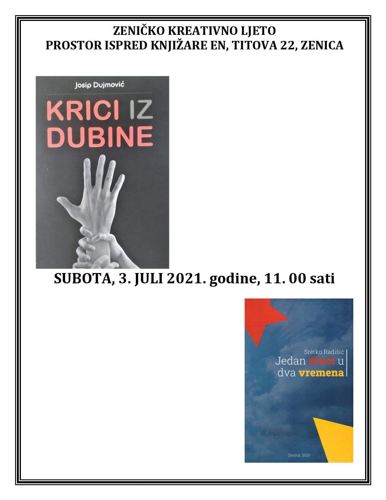 Protekle subote, 03.7.2021.godine, uz organizaciju JU Biblioteka grada Zenice, u programu za odraslu publiku, u Titovoj ulici promovisana su književna ostvarenja Josipa Dujmovića („Krici iz dubine“) i Sretka Radišića („Jedan život u dva vremena“).