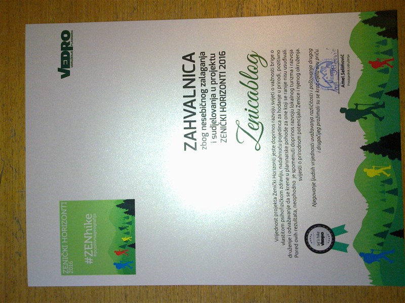 U petak 29.aprila 2016.godine u velikoj Sali Grada Zenica održana je promocija Zeničkih horizonata za 2016.godinu. Naime, Udruženje za razvoj i podršku planinarstva i sportskog turizma “VEDRO” iz Zenice u partnerstvu sa Institutom za zdravlje i sigurnost hrane ZDK, poklonilo je svome gradu treće izdanje projekta “ZENIČKI HORIZONTI”, osmišljenog u cilju promocije Grada, a simbolično u čast Dana Zenice, 580 godina od prvog pominjanja i Dana oslobođenja Zenice, 70 godina od oslobođenja Zenice od fašističkog okupatora.