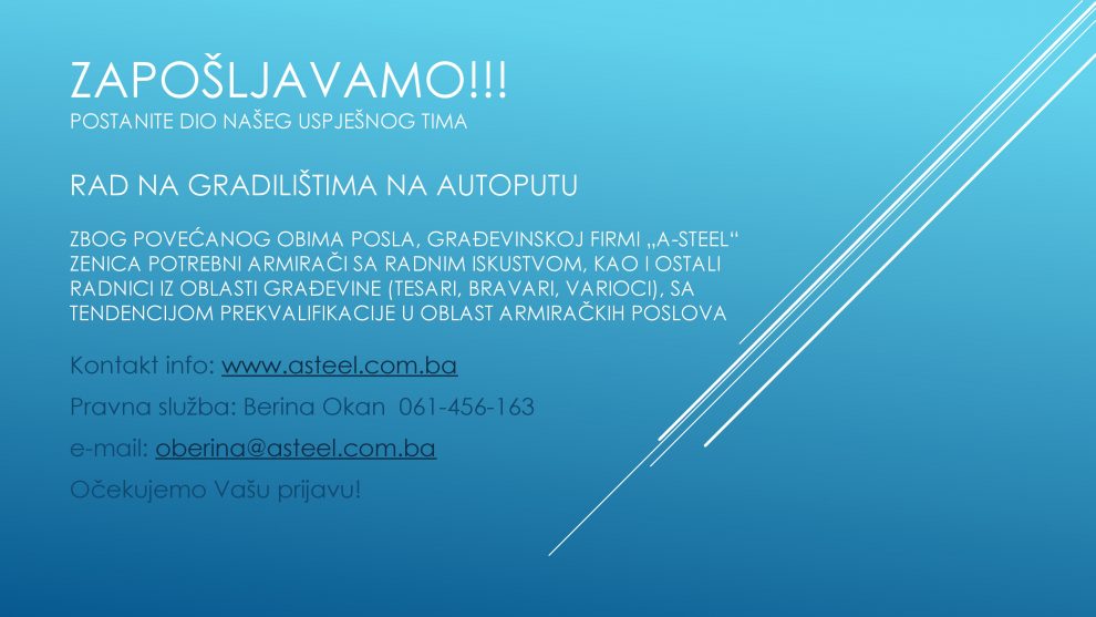 Zbog povećanog obima posla građevinskoj firmi “A-Steel” Zenica potrebni ARMIRAČI SA RADNIM ISKUSTVOM, kao i ostali radnici iz oblasti građevine (tesari, bravari, varioci…), sa tendencijom prekvalifikacije u oblast armiračkih poslova.
