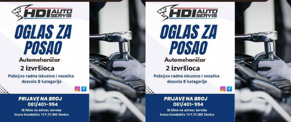 Autoservis HDi, renomirani autoservis u Zenici, traži dva nova radnika za rad u svom timu. Posao obuhvata servisiranje i popravku svih brendova motornih vozila, dijagnostiku, kao i sve druge aktivnosti vezane za održavanje vozila.