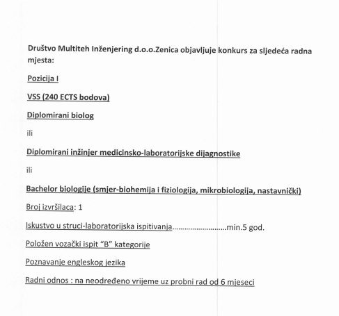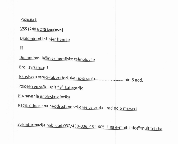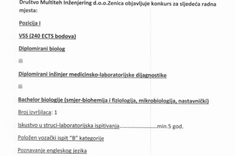 Oglas za posao: diplomirani biolog i diplomirani inžinjer hemije- Firmi Multiteh Inženjering d.o.o. Zenica potrebna dva radnika: