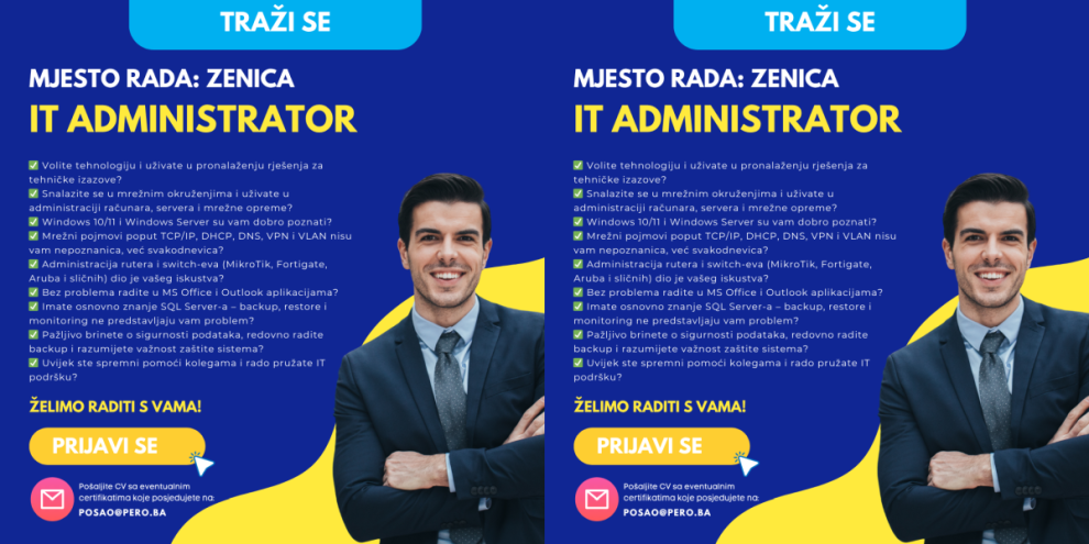 Oglas za posao: IT Administrator u PERO baucentru Zenica- Na osnovu ukazane potrebe kompanija PERO Zenica d.o.o. – raspisuje oglas za prijem na radno mjesto: