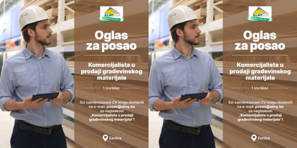 Oglas za posao: Komercijalista u prodaji građevinskog materijala- Almy d.o.o. Zenica objavljuje konkurs za prijem u radni odnos: