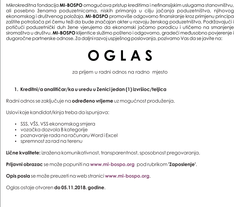 Oglas za posao: MI-BOSPO – potreban kreditni analitičar