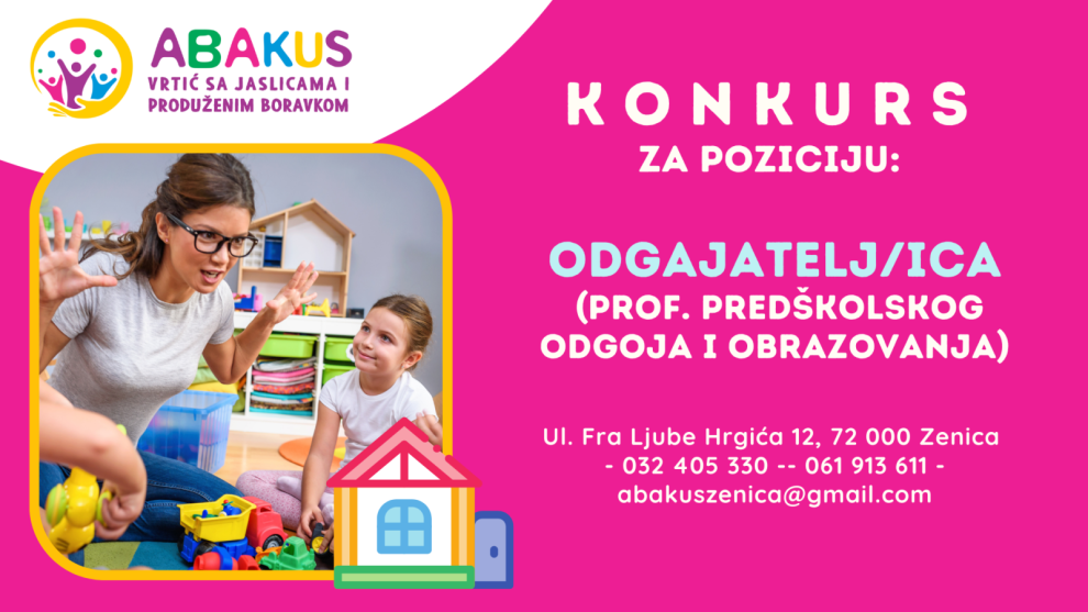 Oglas za posao: Odgajatelj ili odgajateljica (profesor predškolskog odgoja i obrazovanja)- Na osnovu potreba posla Privatna predškolska ustanova „Abakus“ Zenica, dana 3.7.2024. godine, raspisuje