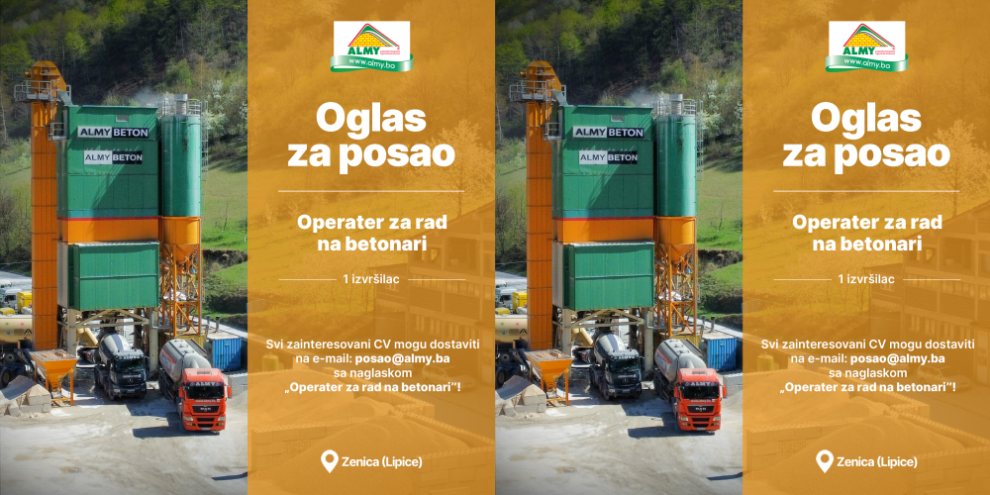 CV dostaviti na e-mail: [email protected] sa naglaskom „Operater za rad na betonari Lipice“.