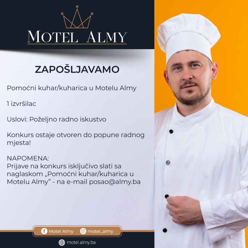 Prijave na konkurs isključivo slati sa naglaskom „Pomoćni kuhar/kuharica u Motelu Almy” – na e-mail [email protected]