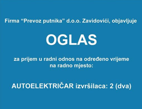 Oglas za posao: potrebni autoelektričari – Firma “Prevoz putnika” d.o.o. Zavidovići, objavljuje Oglas za prijem u radni odnos na određeno vrijeme na radno mjesto: