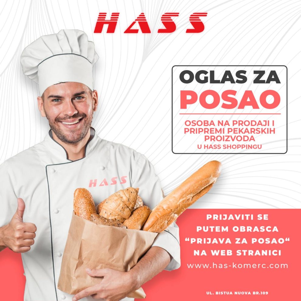 Povodom otvaranja renovirane poslovnice HASS ŠOPING (ul. Bistua Nuova br.109) i proširenja asortimana, firma Hass komerc doo Zenica objavljuje oglas za prijem u radni odnos na sljedećim pozicijama: