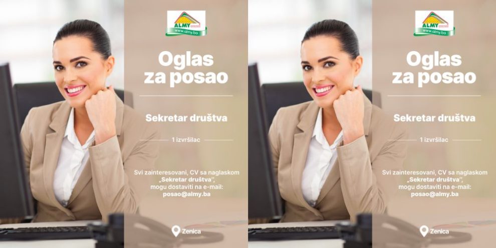 Oglas za posao: Sekretar društva- Almy d.o.o. Zenica objavljuje konkurs za prijem u radni odnos: