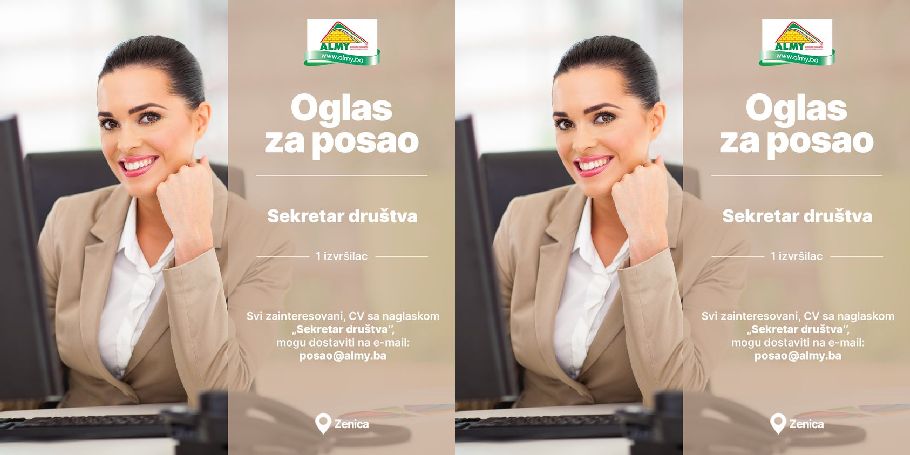 Oglas za posao: Sekretar društva- Almy d.o.o. Zenica objavljuje konkurs za prijem u radni odnos: