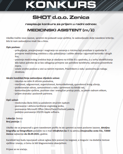 Ukoliko tražite nove izazove, spremni ste pokazati svoje vještine, te zadovoljavate dolje navedene kriterije, bilo bi nam zadovoljstvo imati Vas u timu. primjene medicinskog sredstva u cilju poboljšanja i zašte zdravlja i sigurnost korisnika i drugih