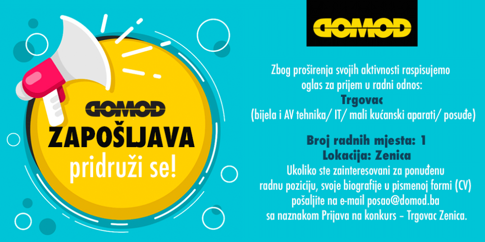 Oglas za posao: trgovac- Firma DOMOD d.o.o. je domaća kompanija sa dugogodišnjim iskustvom u prodaji bijele i audio-video tehnike, IT opreme, malih kućanskih aparata, alata, posuđa i ostalih kućnih aksesoara. Distributeri smo vodećih svjetskih marki: Sony, Samsung, Phillips, Panasonic, HP, Whirlpool, Gorenje, Indesit, Bosch, VOX, Tefal, Rowenta, Miele, Korkmaz i dr. u trinaest prodajnih objekta u BiH.