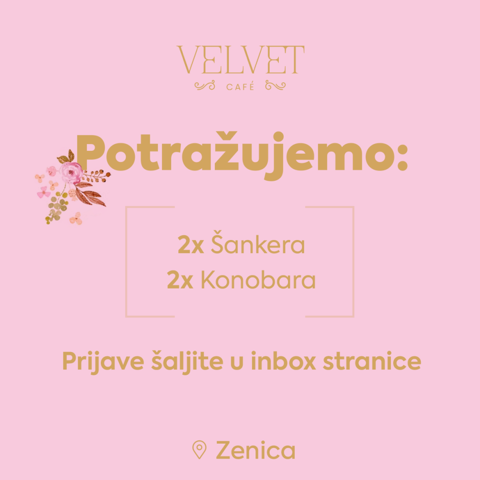 Oglas za posao: Velvet Cafe- novootvoreni objekat- Potrebna dva šankera i dva konobara za novootvoreni objekat (uskoro) Velvet Cafe.