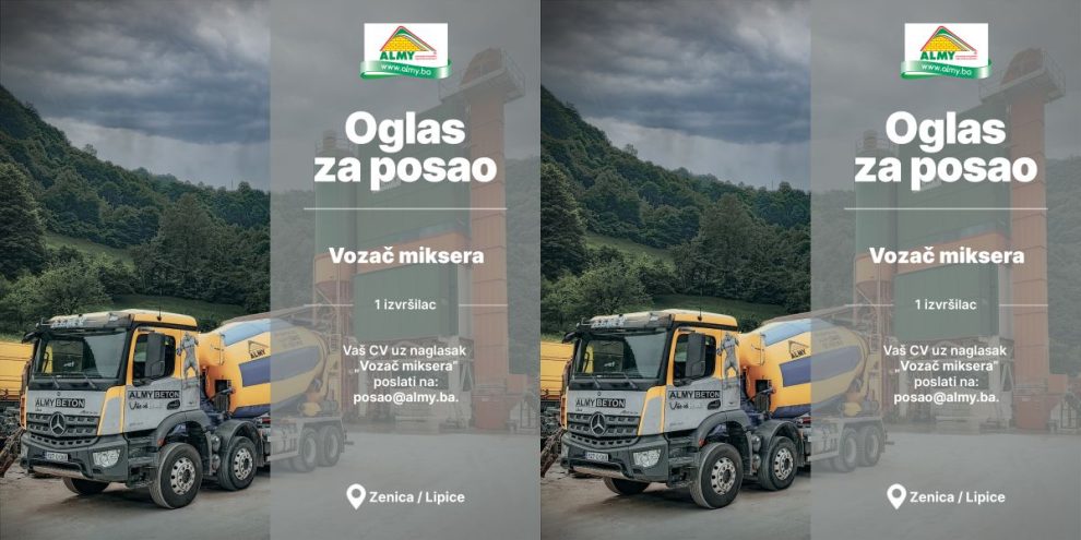 Oglas za posao: Vozač miksera- Almy d.o.o. Zenica objavljuje konkurs za prijem u radni odnos: