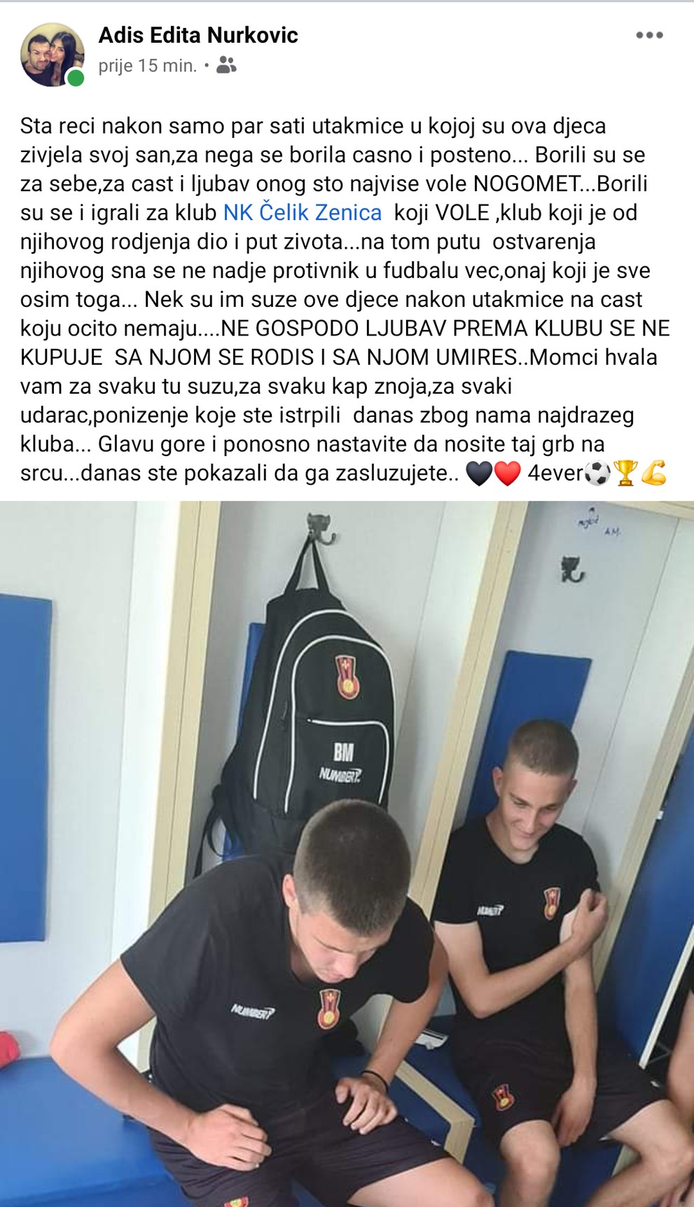 “Šta reći nakon samo par sati utakmice u kojoj su ova djeca živjela svoj san, za njega se borila časno i pošteno. Borili su se za sebe, za čast i ljubav onog sto najviše vole, nogomet! Borili su se i igrali za NK Čelik Zenica koji vole, klub koji je od njihovog rođenja dio i put života. Na tom putu ostvarenja njihovog sna se ne nađe protivnik u fudbalu već onaj koji je sve osim toga”, napisao je Nurković na svom FB profilu i dodao: