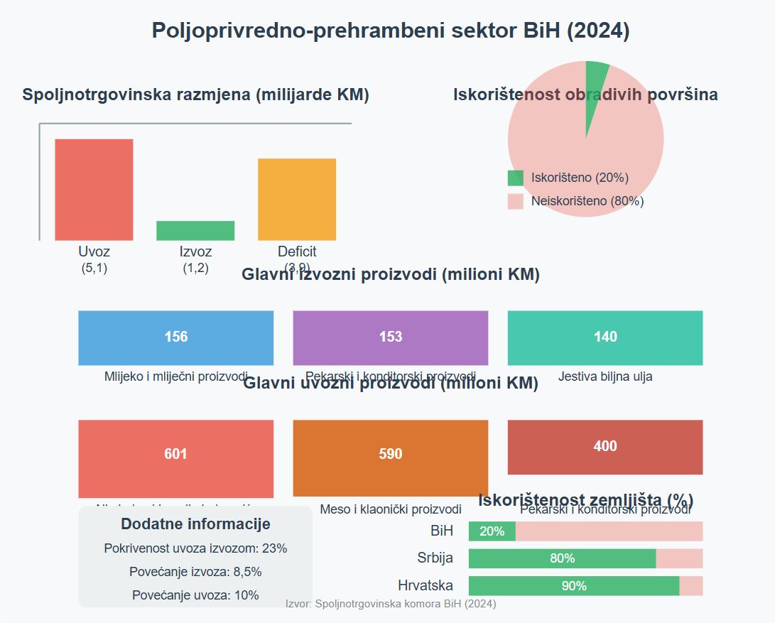 Prema njegovim riječima, poljoprivredni sektor je karakterističan po tome što je pokrivenost uvoza izvozom najmanja i u prošloj godini iznosila je 23 odsto, a ako se pogleda ukupan spoljnotrgovinski deficit, samo ovaj sektor čini trećinu spoljnotrgovinskog deficita BiH.