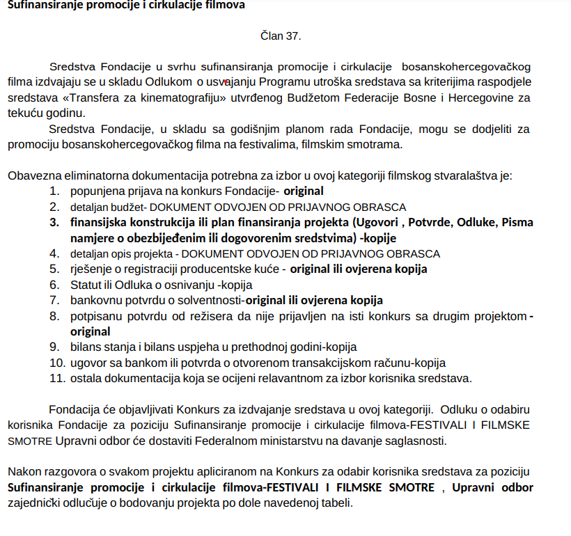 I tu nije kraj ove afere. Sporna je i Odluka koju je Fondacija za kinematografiju, odnosno Komisija koja radi u nepotpunom sastavu donijela 26.06.2023. godine a kojom se stavlja van snage tabela broj 2 člana 37. Pravilnika o procedurama i kriterijima za izbor korisnika sredstava Fondacije za kinematografiju broj: 04-3-254/21 od 20.12.2021.godine, te u skladu s tim će se dodjeljivati iznos finansijske podrške nevodeći se bodovnom listom jer bi u suprotnom od ukupnom broja aplikanata sredstva dobilo samo 3 aplikanta.