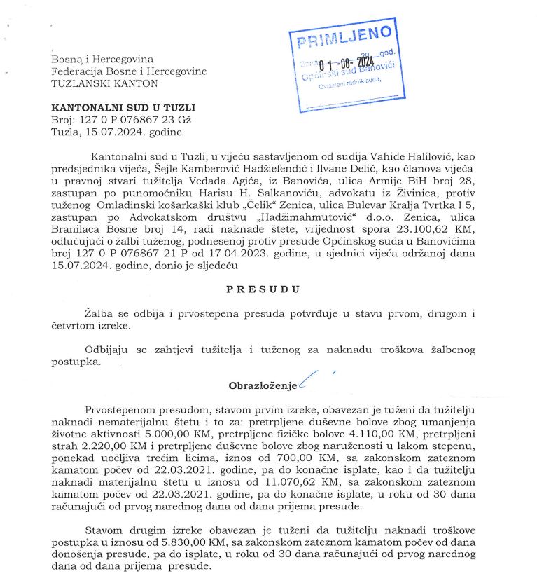 Kantonalni sud u Tuzli potvrdio je presudu u korist košarkaša Vedada Agića, koji je tužio OKK Čelik zbog povrede zadobijene tokom utakmice 2019. godine. Sud je zaključio da je protivnički igrač nesportskom greškom nanio Agiću ozbiljnu povredu koljena, zbog čega mu je prekinuta karijera. Klub je dužan isplatiti 23.700 KM odštete, plus troškove postupka. Sud je odbacio žalbu Čelika, ocijenivši je neosnovanom.