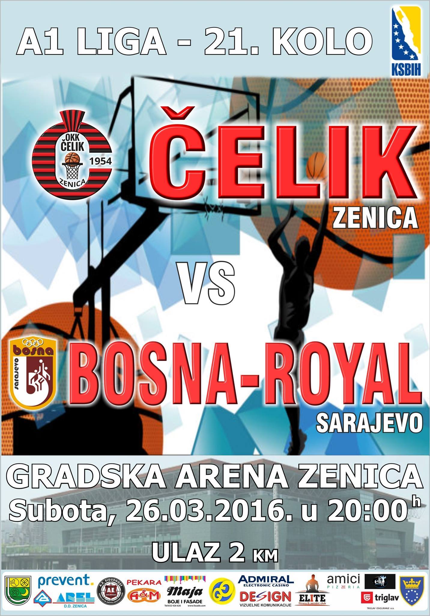 Utakmica OKK Čelik – KK Bosna Royal na rasporedu je u subotu 26.marta 2016.godine u Areni Zenica, sa početkom u 20,00 sati. Ulaz je 2 KM.