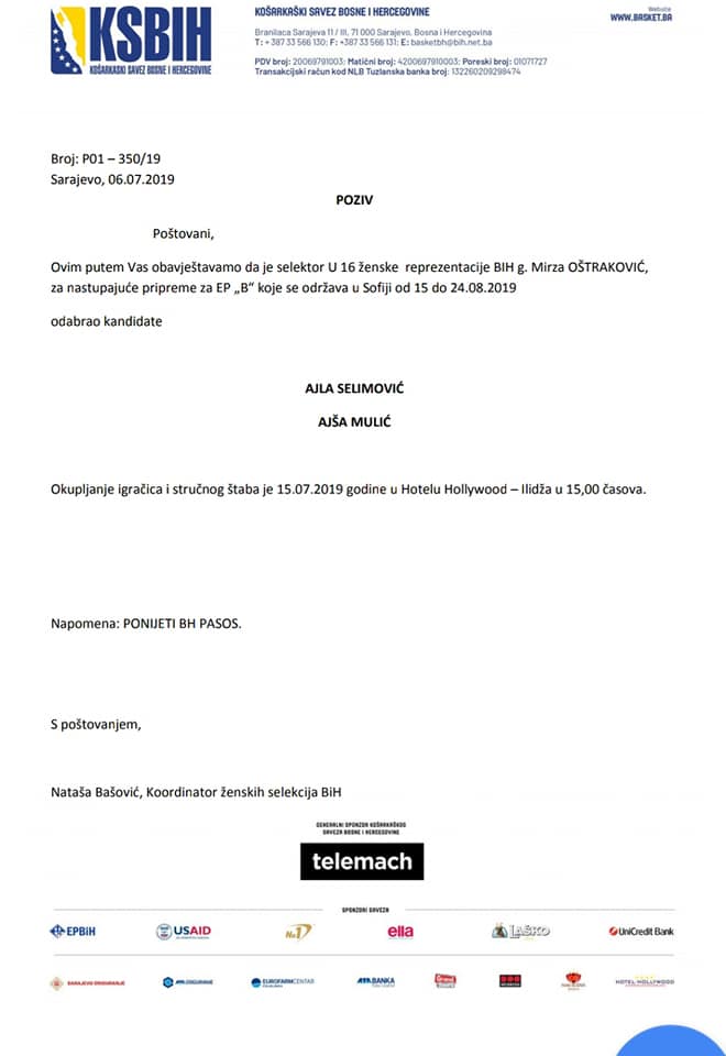 Okupljanje naših košarkašica je zakazano za 15. juli 2019. godine u hotelu Holywood na Ilidži.