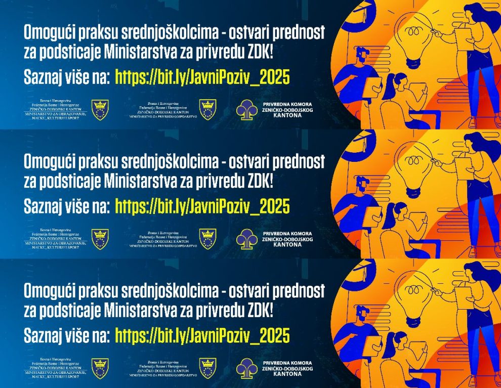 Privredna komora i Ministarstvo za privredu Zeničko-dobojskog kantona pozivaju privredne subjekte da iskoriste jedinstvenu priliku: omogućavanjem prakse za srednjoškolce možete ostvariti dodatne bodove pri dodjeli podsticaja Ministarstva za privredu ZDK.