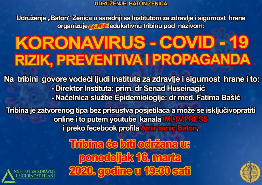 ONLINE TRIBINA: Koronavirus – rizik, preventiva i propaganda – edukacija ponedjeljak 19:30h  – U cilju savjesnog i preventivnog djelovanja, te sprečavanja svih neželjenih posljedica u zaštiti građana, Udruženje „Baton“ Zenica u saradnji sa Institutom za zdravlje i sigurnost  hrane organizuje ONLINE  edukativnu tribinu pod  nazivom: